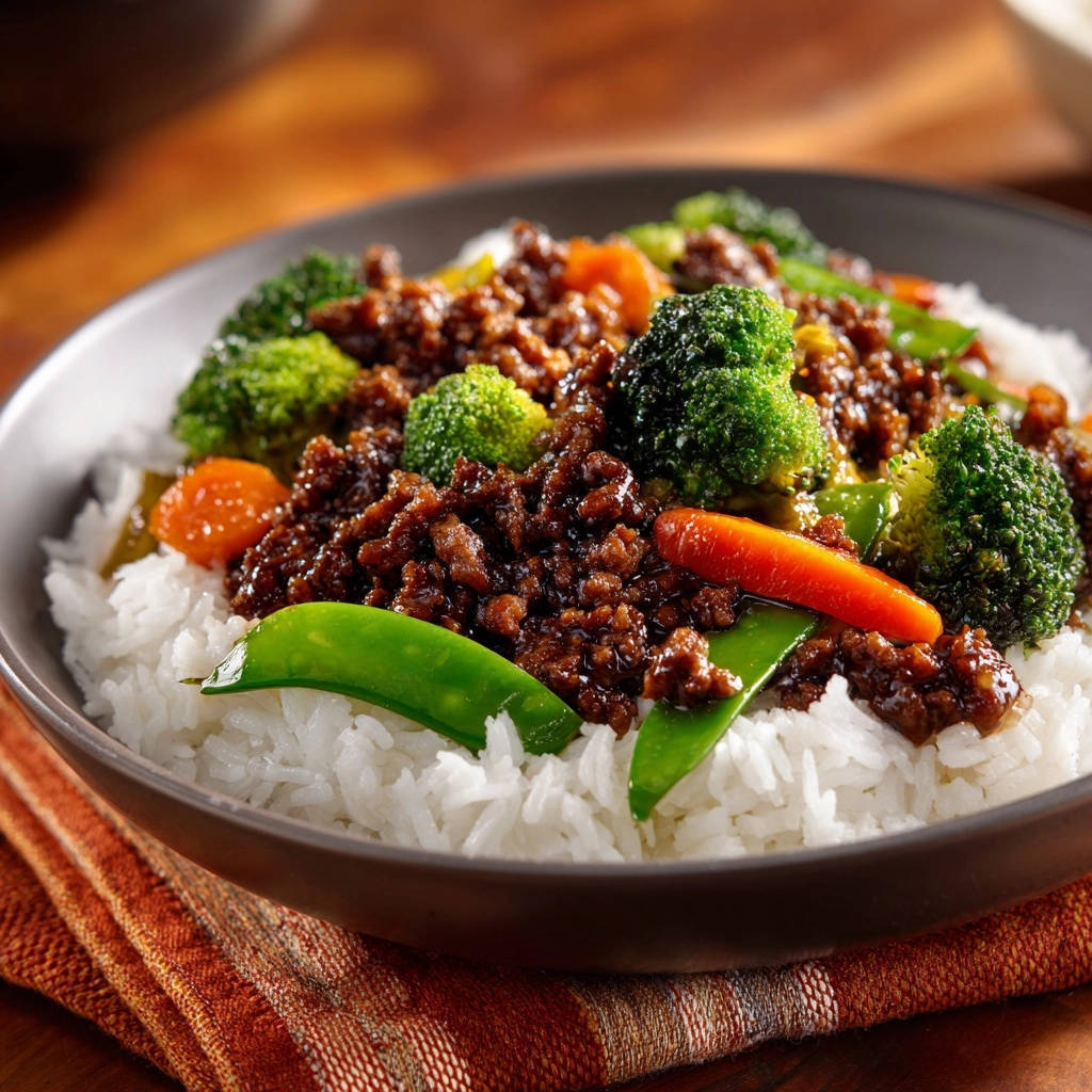 Serviere die Asiatische Hackfleischpfanne großzügig über dem frisch gekochten Reis und genieße dein selbstgemachtes Meisterwerk.