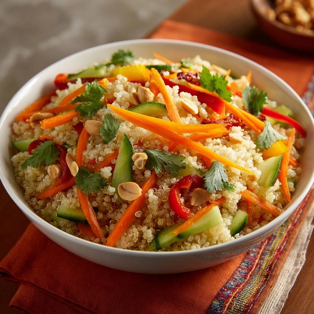 Stell dir vor, du nimmst die erste Gabel dieses bunten Quinoa-Gemüsesalats. Die fluffigen Körner mischen sich mit knackigen Karottenstreifen, saftiger Gurke und süßen Paprikastücken. Dazu der frische Duft von Koriander und das Knacken der gerösteten Erdnüsse – purer Sommer auf dem Teller.
