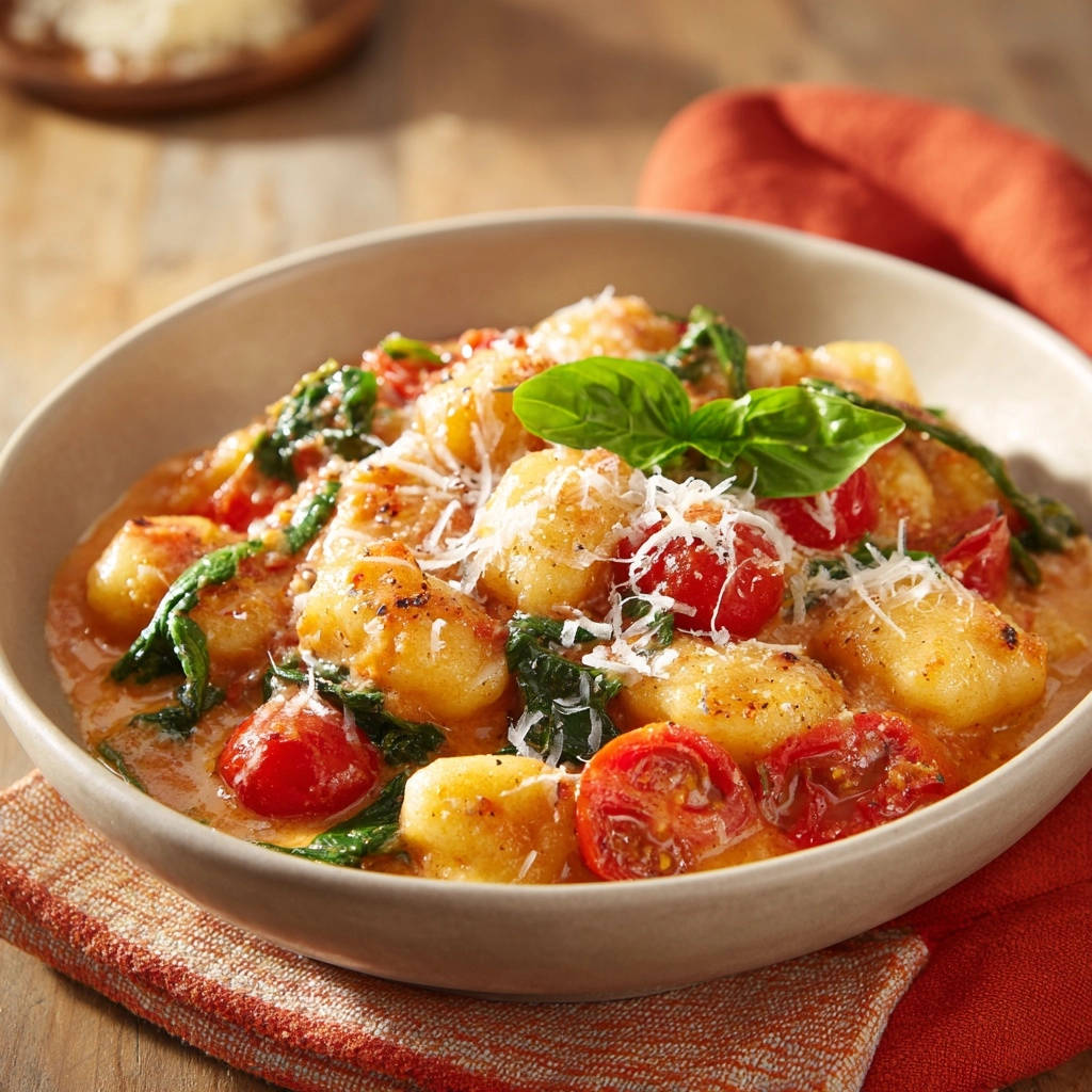 Dieses Rezept für Cremige Gnocchi mit Tomaten und Spinat ändert alles! Ich zeige dir, wie du unwiderstehlich goldbraune, außen knusprige und innen zarte Gnocchi zubereitest, die perfekt mit einer samtigen Soße harmonieren.