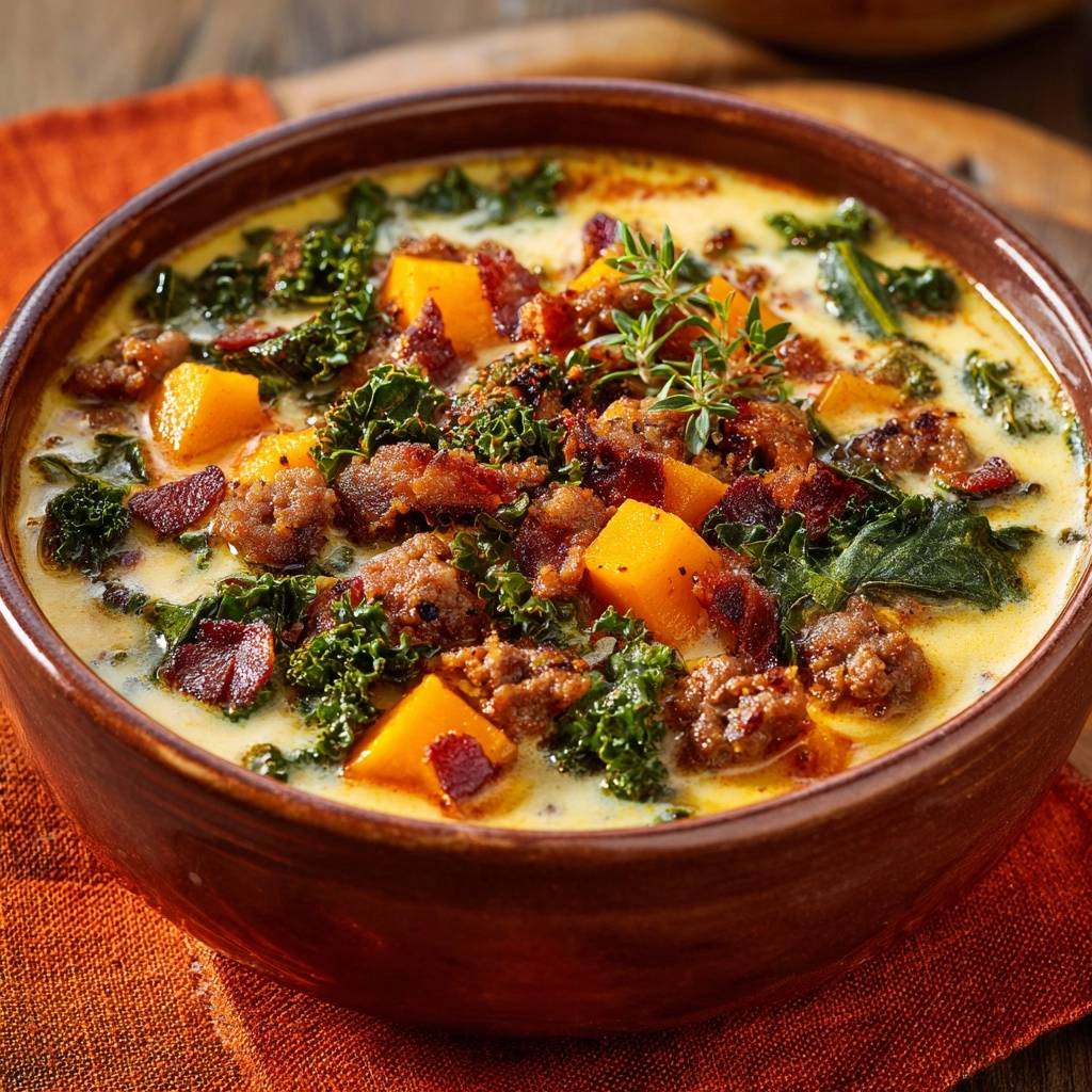Cremige Grünkohl-Kürbis-Suppe mit Wurst und Speck