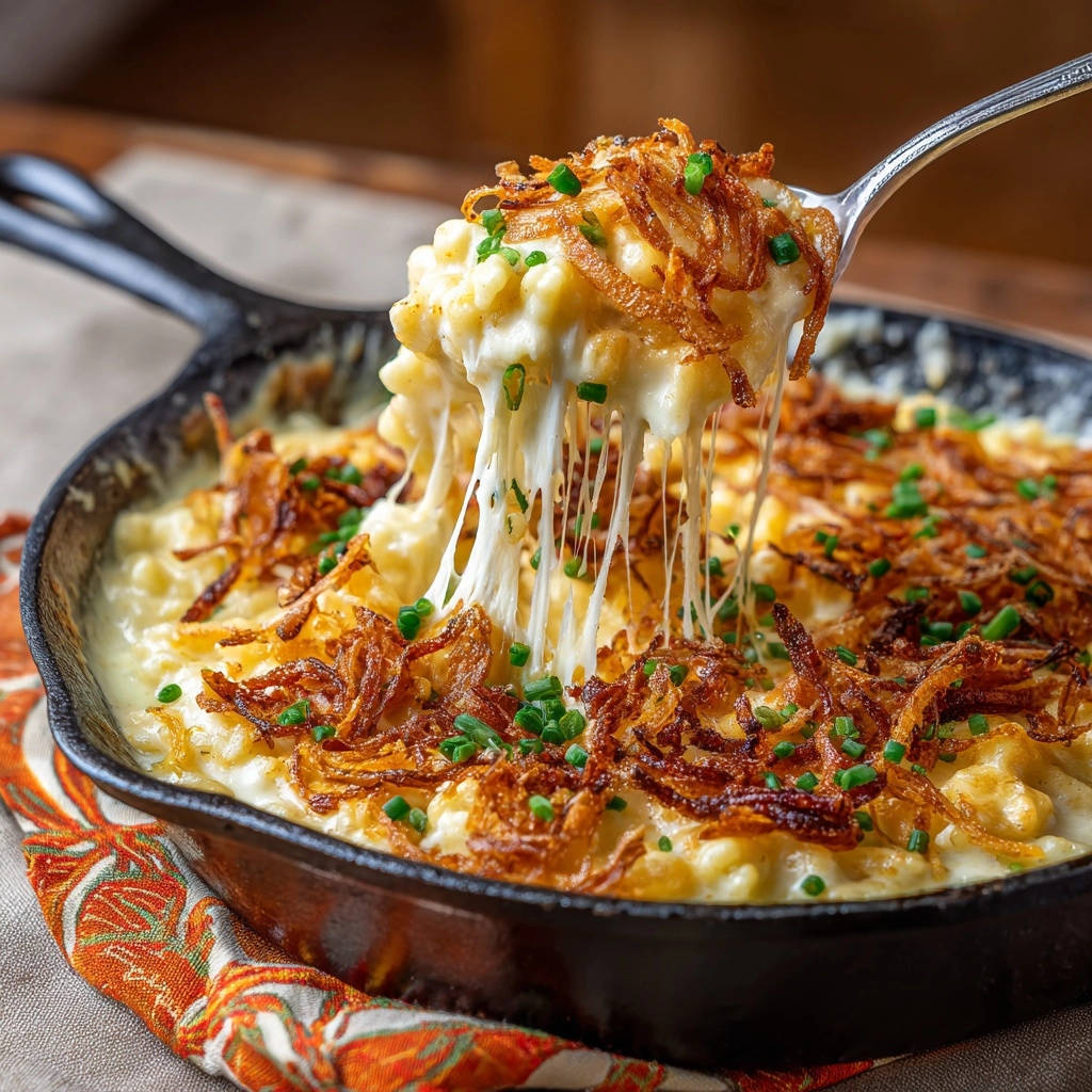 Bestreuen Sie jede Portion großzügig mit den knusprigen Röstzwiebeln und frischem, gehacktem Schnittlauch. Dies sorgt für Textur, Frische und ein ansprechendes Aussehen.