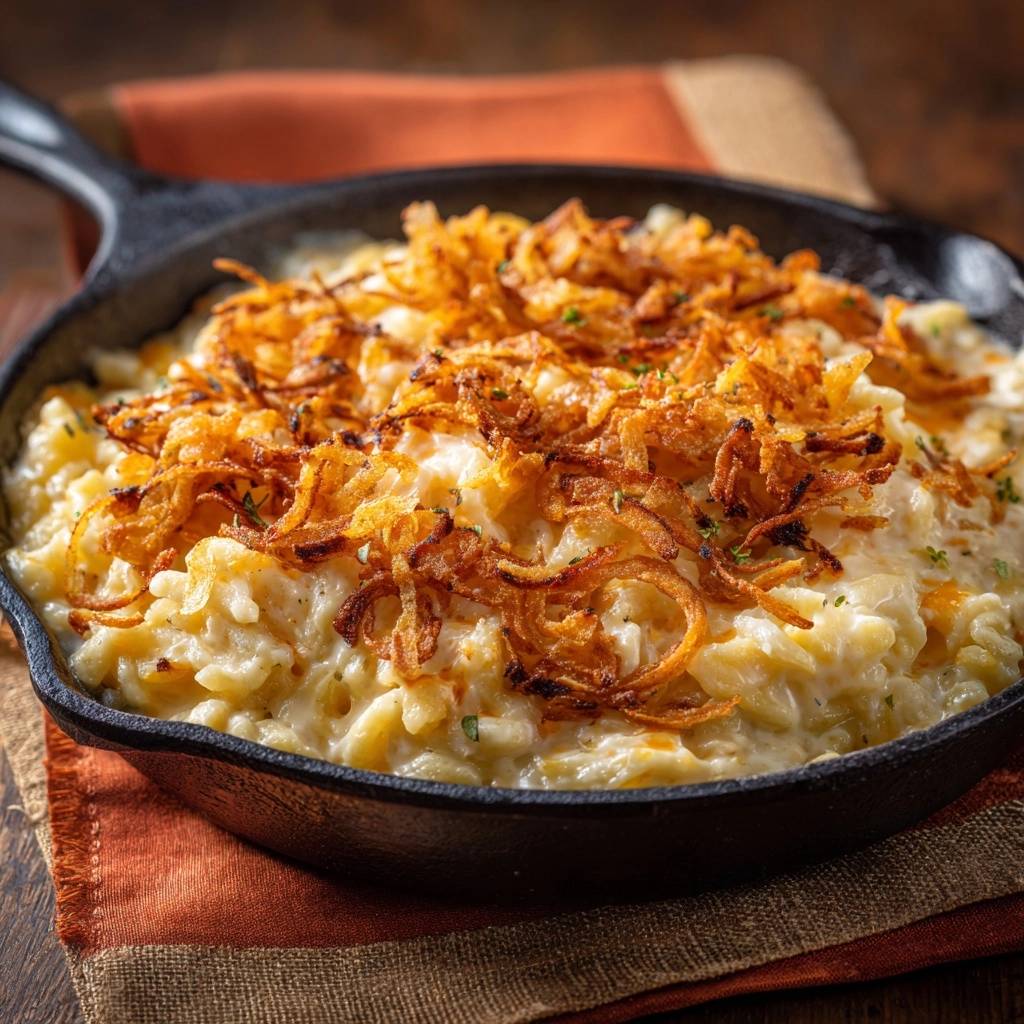 Stell dir vor, du schaufelst die Gabel in diesen cremigen Kartoffelauflauf mit knusprigen Zwiebeln. Der erste Bissen explodiert im Mund: weiche, saftige Kartoffeln, die sich in geschmolzenem Käse auflösen, oben drauf der Biss der frittierten Zwiebeln. Kein Matsch, nur pure Wonne.