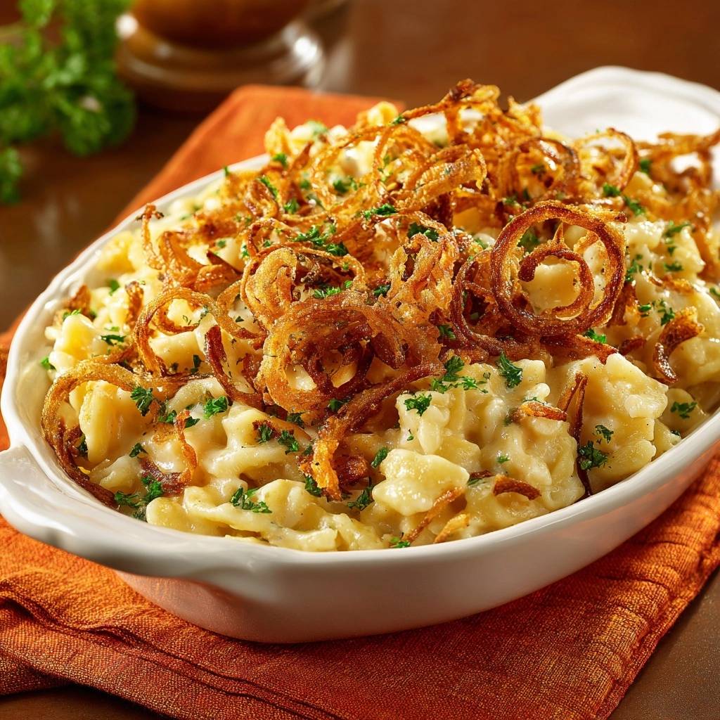 - Auflauf aus dem Ofen nehmen. Heiße Zwiebeln sofort großzügig darüber streuen – nie vorher, das ist der Knusprigkeits-Trick: Die Restwärme des Auflaufs klebt sie fest, ohne sie matschig zu machen. Mit gehackter Petersilie bestreuen. Sofort servieren. Guten Appetit!