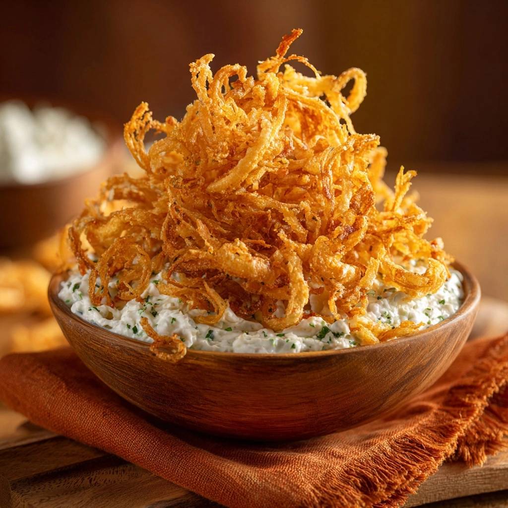 Der Duft steigt auf, als die Zwiebelstreifen das zweite Mal ins heiße Öl tauchen. Knusprig, goldbraun und so leicht, dass sie fast schweben. Dann türmst du sie auf den cremigen Dip, und beim ersten Löffel explodiert Frische im Mund: der milde Kräuteraroma mischt sich mit der salzigen Bissigkeit.