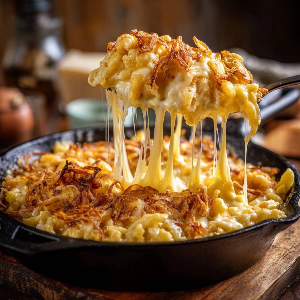 - Das Highlight gegen matschige Zwiebeln: Während der Backzeit die Zwiebelringe in heißem Öl (170 °C) portionsweise 1-2 Minuten frittieren, bis sie goldknusprig sind. Auf Küchenpapier abtropfen lassen – so bleiben sie absolut trocken und knusprig! Direkt nach dem Backen heiß über den Mac streuen. Sofort servieren, damit der Käse-Pull explodiert und die Zwiebeln knacken. Guten Appetit!