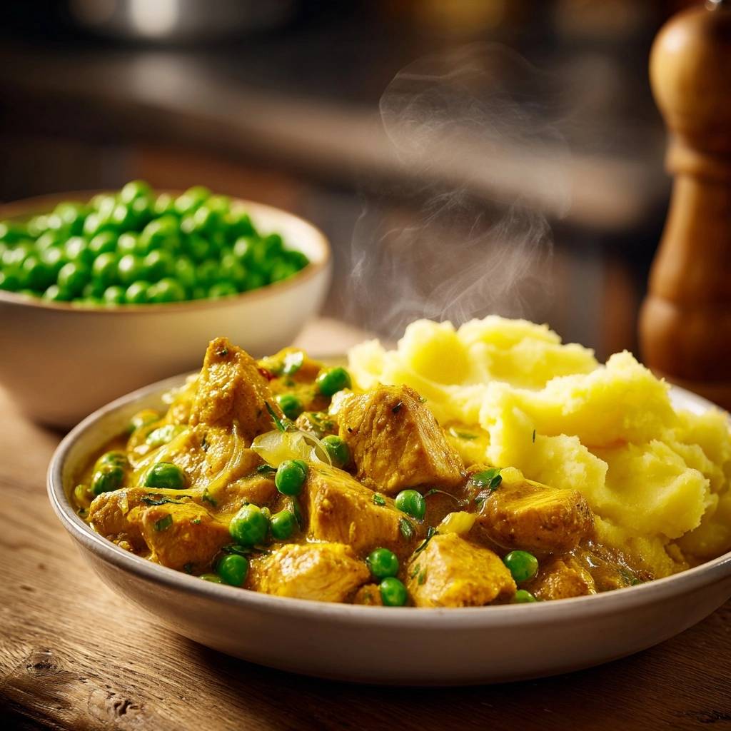 600g Hähnchenbrustfilet, in mundgerechte Stücke geschnitten 300g Erbsen (frisch oder TK) 1 große Zwiebel, in feine Halbringe geschnitten 2 Knoblauchzehen, fein gehackt 400ml Kokosmilch (unbedingt die Vollfett-Variante für die Bindung nutzen) 100ml Sahne für die extra cremige Textur 2 EL mildes Currypulver 1 TL Kurkuma für die intensive Farbe 1 EL frischer Koriander oder Petersilie, gehackt Salz und Pfeffer 2 EL Pflanzenöl 800g mehligkochende Kartoffeln 60g Butter 120ml warme Milch Eine Prise Muskatnuss