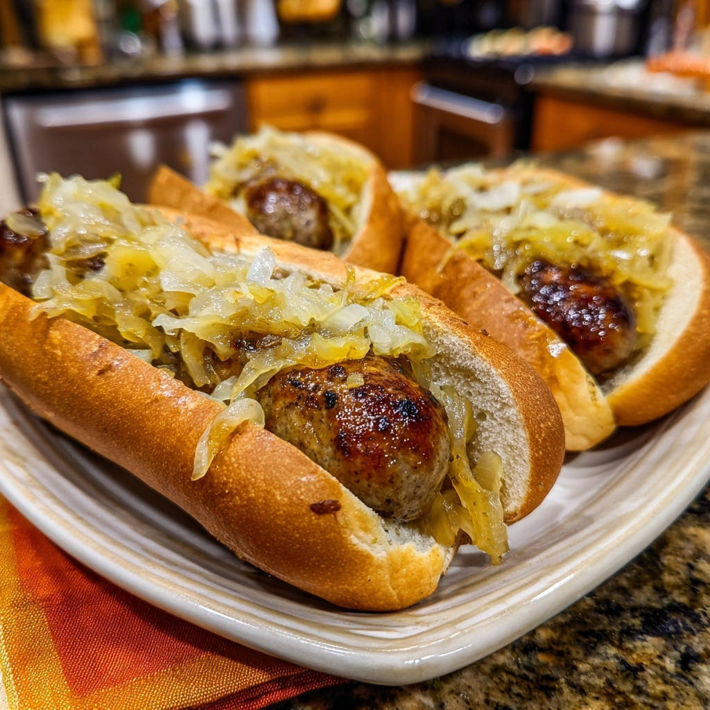 Lege jeweils eine perfekt gebratene, saftige Bratwurst in ein warmes Brötchen und gib eine großzügige Portion der karamellisierten Zwiebeln darauf.