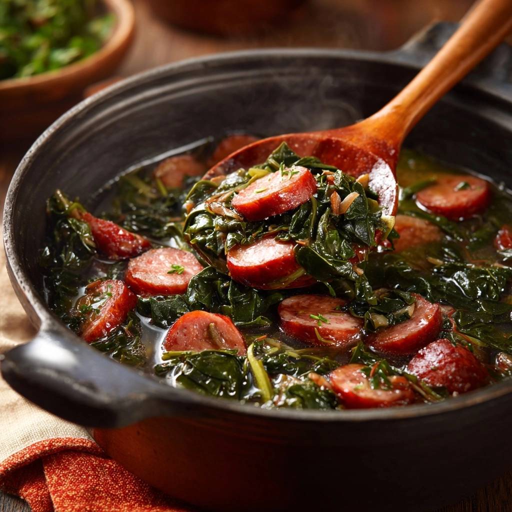 - Abschmecken und servieren. Der Eintopf ist jetzt texturperfekt: Bissfeste Stiele, knackige Blätter, saftige Wurst in sämiger Brühe. Guten Appetit!