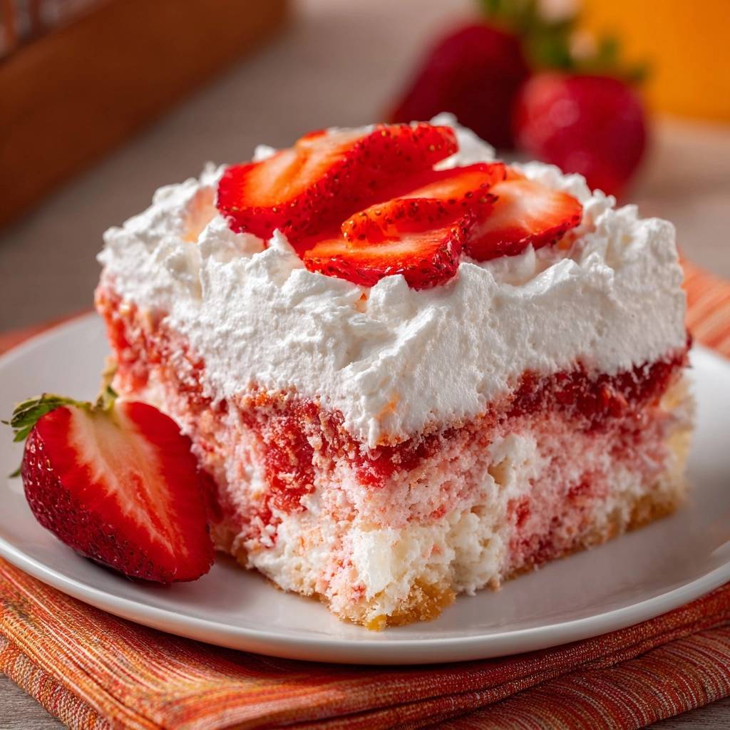 Stell dir vor, du beißt in diesen Erdbeer-Sahne-Poke-Kuchen rein. Die fluffige Krume saugt die süße Erdbeergelatine auf, bleibt aber fest und saftig, ohne je matschig zu werden. Der Duft von frischen Beeren mischt sich mit cremiger Sahne, und jede Gabel fühlt sich wie Sommer an.