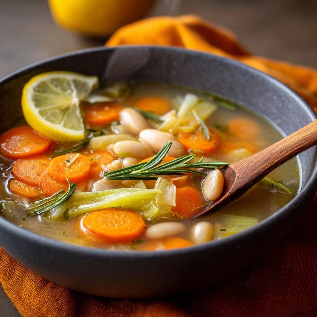 Der Dampf steigt auf, Rosmarin duftet intensiv und der erste Löffel bringt knackige Karottenstücke, cremige Bohnen und eine frische Zitronennote. Diese Suppe hat mich umgehauen, weil sie so einfach ist und doch perfekt schmeckt. Du spürst die Süße der Karotten, die knackige Sellerie und Bohnen, die saftig bleiben.