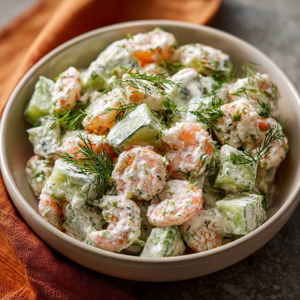 Dieser Frische Garnelen-Gurken-Salat ist ein echtes Juwel unter den Sommerrezepten. Er vereint Leichtigkeit, unvergleichliche Frische und eine Textur, die dank des cleveren Gurken-Tricks immer perfekt knackig bleibt. Die ausgewogene Kombination aus zarten Garnelen und dem cremigen Dill-Dressing macht ihn zu einem Genuss, der auf der Zunge zergeht.