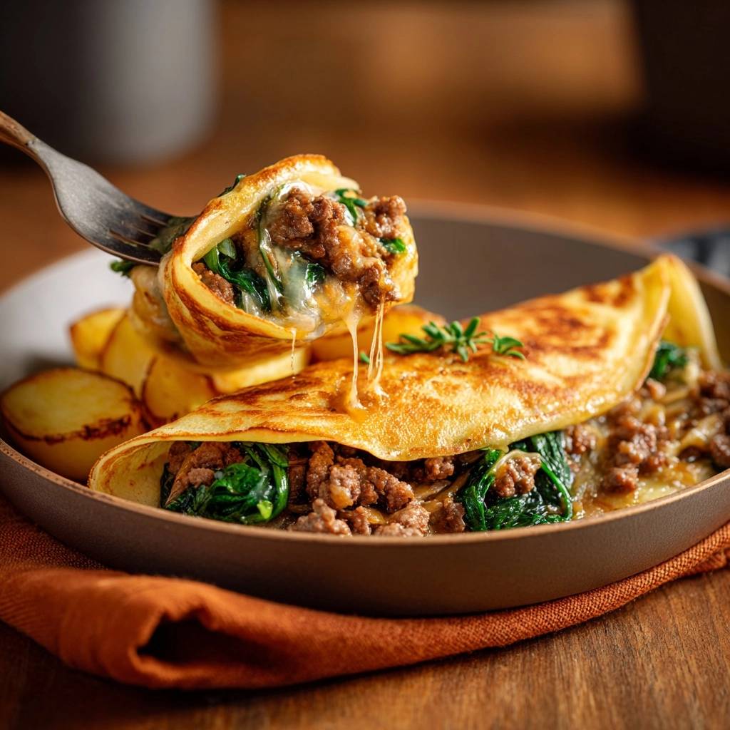 Stell dir vor, du beißt in eine goldbraune Crespelle, die außen knusprig ist und innen saftig mit einer würzigen Rinderhack-Spinat-Füllung explodiert. Der Käse schmilzt cremig auf der Zunge, während der Spinat eine leichte Frische bringt. Dazu knusprige Kartoffeln, die perfekt passen.
