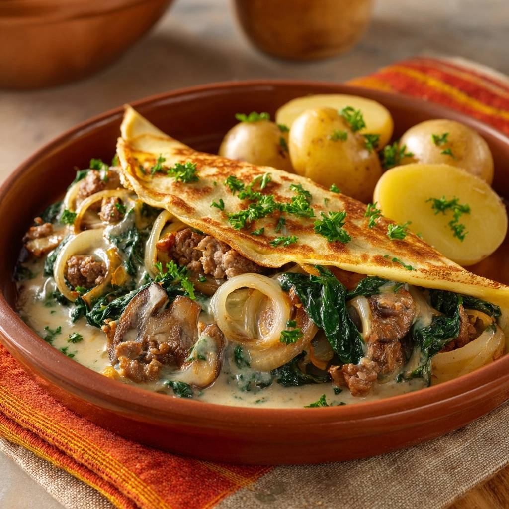 Gefülltes Spinatomlette mit Hack, Pilzen und Sahnesoße