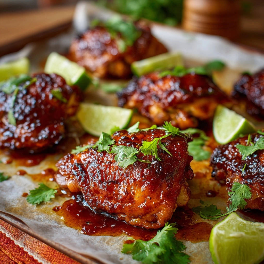 - Serviere die glasierten Hähnchenschenkel heiß, garniert mit frischem Koriander und Limettenspalten zum Beträufeln.