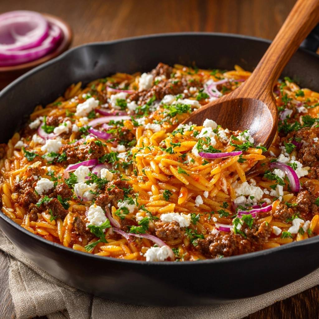 Griechische Hack-Nudel-Pfanne (Nie wieder matschige Nudeln!)