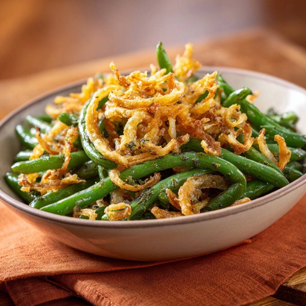 Grüne Bohnen mit knusprigen Zwiebelringen