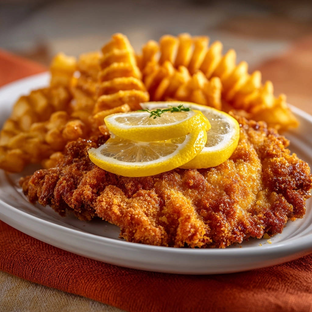 - Servieren Sie die Hähnchen-Schnitzel zusammen mit den knusprigen Waffelpommes. Garnieren Sie jedes Schnitzel mit frischen Zitronenscheiben und einem kleinen Zweig Thymian. Der Saft der Zitrone sorgt für die perfekte Frische.