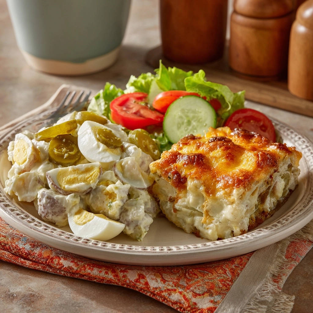 Da Gratin und Kartoffelsalat schon sehr reichhaltig sind, würde ich leichte Beilagen empfehlen. Ein knuspriges Hähnchenbrustfilet, ein mageres Steak oder gebratener Fisch wären ausgezeichnete Eiweißquellen.