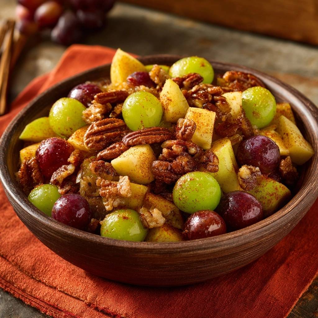 Stell dir vor, du nimmst die erste Gabel dieses herbstlichen Apfel-Trauben-Salats mit Pekannüssen. Der Apfel knirscht knackig, die Trauben platzen saftig im Mund, und dann diese Pekannüsse: goldbraun geröstet, mit Zimt umhüllt, total knusprig. Kein bisschen matschig, trotz all dem Fruchtsaft.