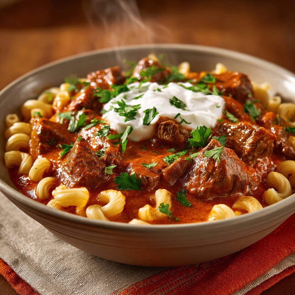 Herzhaftes Rindergulasch mit Makkaroni: Zartheit, die auf der Zunge zergeht