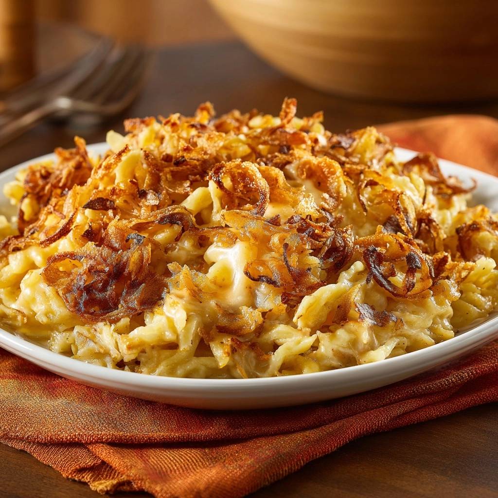 Verteile die Spätzle auf Teller und toppe großzügig mit den knusprigen Zwiebeln. Servier sofort, damit der Käse Fäden zieht und die Zwiebeln knacken. Pures Glück.
