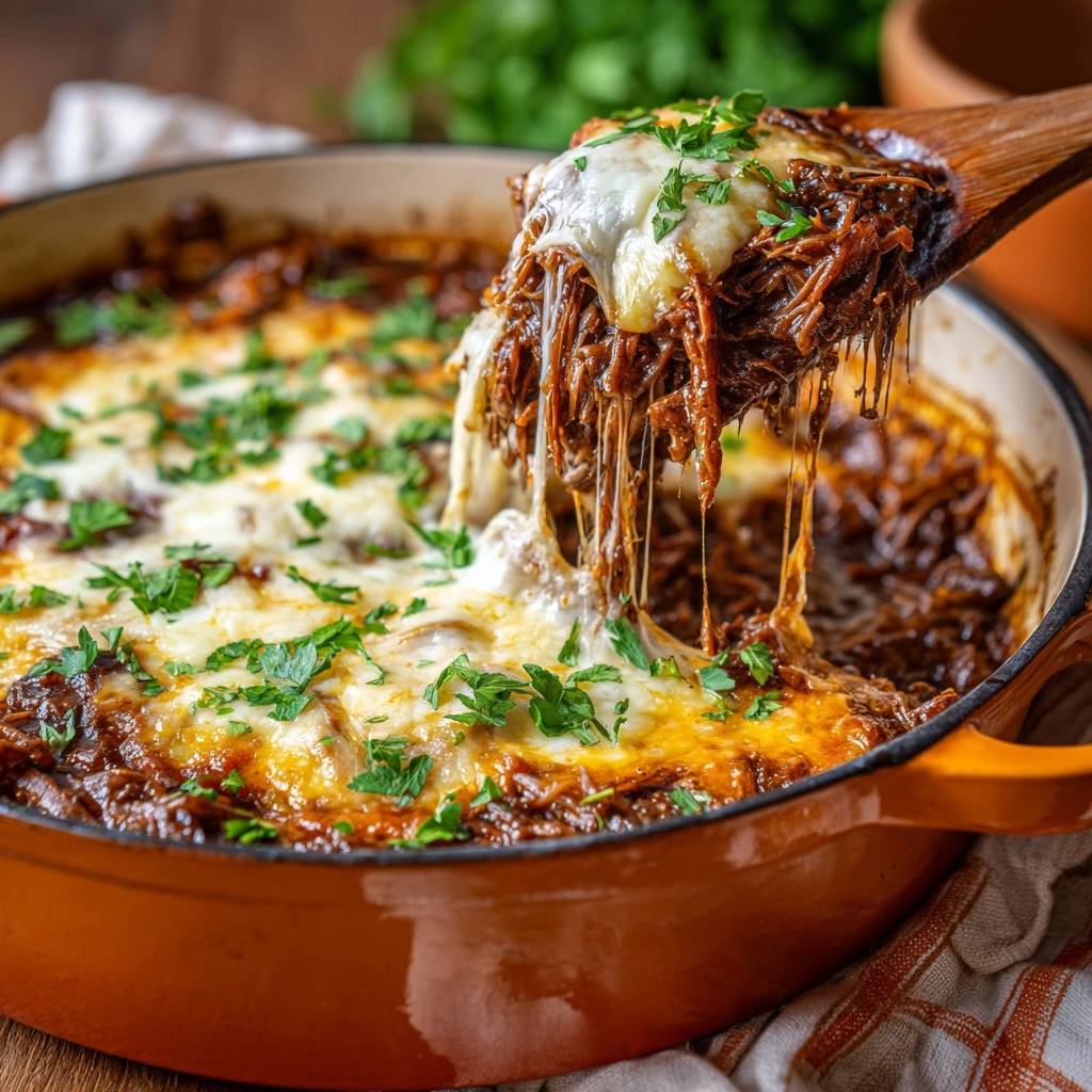 Stell dir vor, du beißt in pulled Rindfleisch, das so butterzart zerfällt, dass die Gabel nur hingehalten werden muss. Der Käse zieht goldbraun, die Soße umhüllt alles saftig und würzig. Nie wieder trockenes Pulled Beef!