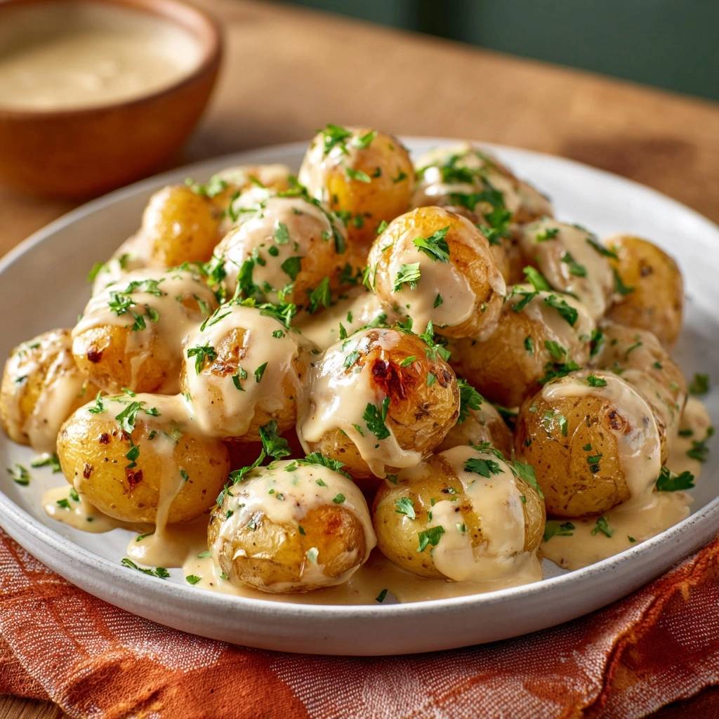 - Kartoffeln auf einem Teller anrichten, Sauce darüberträufeln oder separat servieren. Fertig – knusprig, cremig, himmlisch!