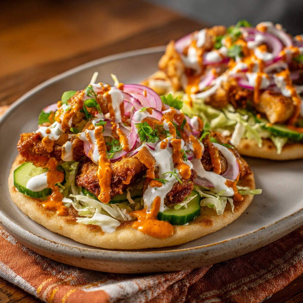 Was wäre ein knuspriger Hähnchen-Fladen ohne seine frischen Begleiter? Fein geschnittener Eisbergsalat oder Weißkohl, knackige Gurkenscheiben und hauchdünne rote Zwiebelringe bilden die ideale Textur- und Geschmackskulisse.