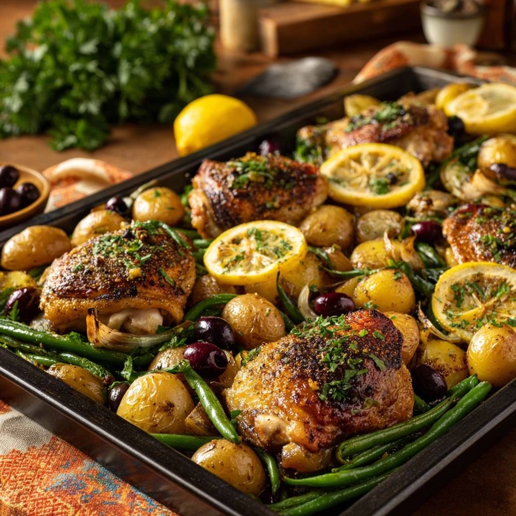 Knusprige Hähnchenkeulen mit Ofenkartoffeln, Bohnen, Oliven & Zitrone