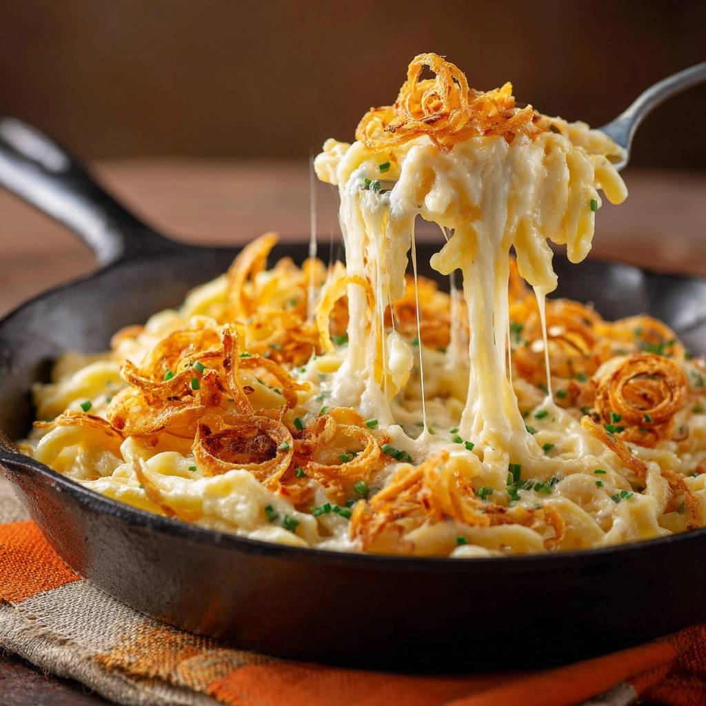 Der erste Bissen haut dich um. Cremiger Käse umhüllt die Nudeln, zieht sich wie ein seidiger Faden, und oben drauf knacken goldbraune Zwiebelringe mit perfekter Bissfestigkeit. Kein Matsch, nur pure Knusprigkeit. Das sind knusprige Käsenudeln mit Zwiebelkrönchen, dein neuer Comfort-Food-Traum.