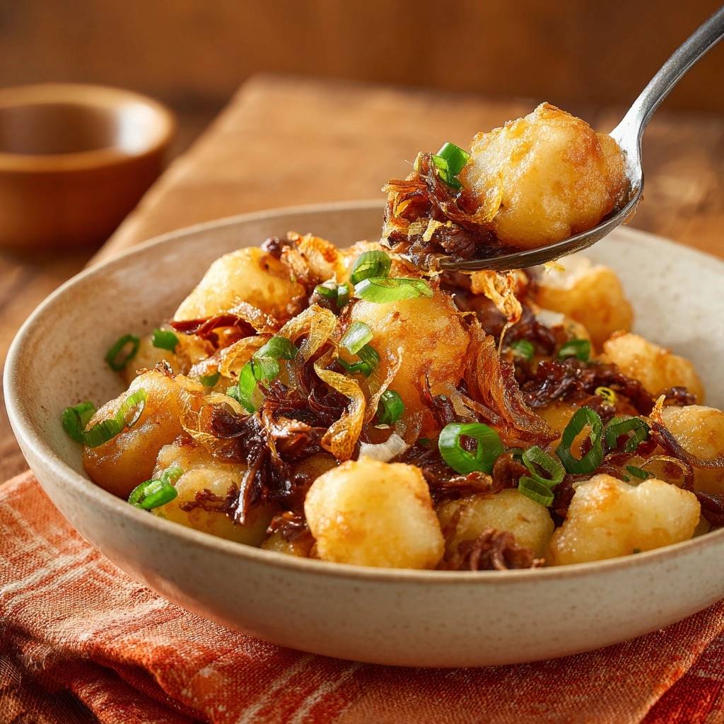 - Zwiebelstreifen separat in heißem Öl knusprig braten (1 Minute), abtropfen. Bällchen mit Frühlingszwiebeln und Zwiebelstreifen toppen. Heiß servieren – perfekte Knusprigkeit garantiert!