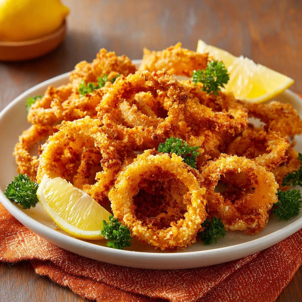 Garniere sie mit frisch gehackter Petersilie und lege Zitronenspalten dazu. Ein Spritzer Zitrone verleiht den Ringen eine belebende Frische, die perfekt zum herzhaften Geschmack passt. Genieß den perfekten Knuspermoment!