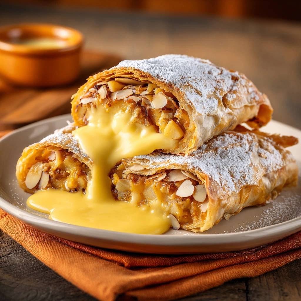 Stell dir vor, du beißt in den ersten Happen vom Knusprigen Apfel-Mandel-Strudel mit Vanillesauce. Der Teig knackt so herrlich, die Äpfel sind saftig, Mandeln geben Crunch, und die warme Sauce umhüllt alles cremig.
