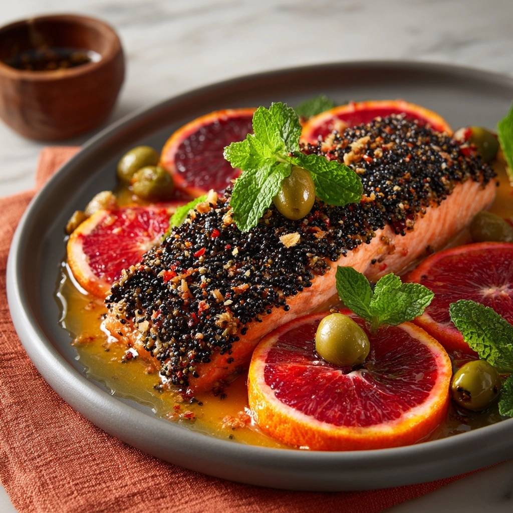 Stell dir vor, du beißt in diesen Lachs rein. Die Sesamkruste knackt so herrlich, und innen ist er butterzart saftig. Der Blutorangensaft mischt sich mit der leichten Schärfe der Chiliflocken, und die Minze bringt Frische rein. Das ist pure Freude auf dem Teller.