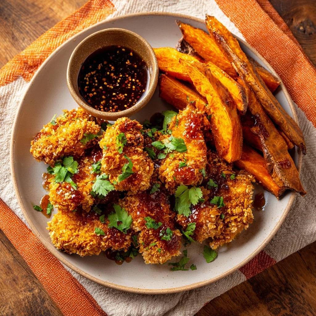 Der Biss in dieses knusprige Glasur-Hähnchen mit Süßkartoffel-Fries ist einfach unschlagbar. Draußen knistert die Panko-Panade, innen saftig das Hähnchenfleisch, und die süß-würzige Sauce klebt gerade so viel, dass sie perfekt haftet. Dazu die goldenen Fries, die bei jedem Knacken süßlich nach Paprika duften.