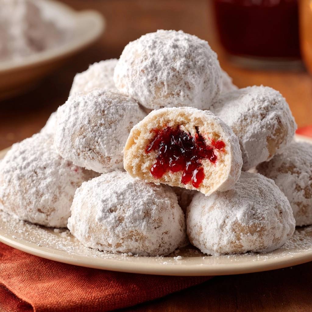 - Kekse mehrmals in Puderzucker wälzen, bis sie dick weiß überzogen sind. Fertig – saftige Füllung, perfekte Textur!