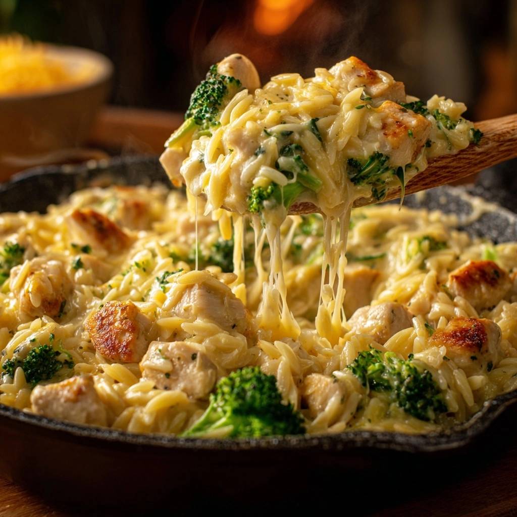 Der Duft steigt auf, als der Käse in der cremigen Soße schmilzt. Du nimmst den ersten Bissen: Saftiges Hähnchen, das zergeht, umhüllt von weichem Orzo und knackigem Brokkoli. Alles in einer Pfanne, ohne Chaos in der Küche.