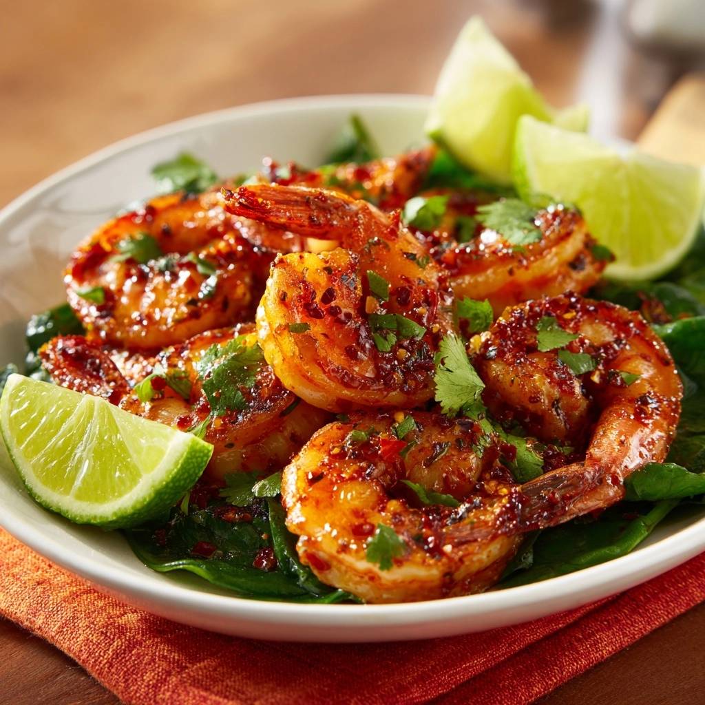 - Richten Sie die Garnelen auf dem Spinatbett an. Bestreuen Sie das Gericht großzügig mit frischem Koriander und legen Sie die Limettenspalten dazu. Die Säure der Limette ist essenziell, um die Süße des Honigs und die Schärfe der Chili perfekt auszubalancieren.