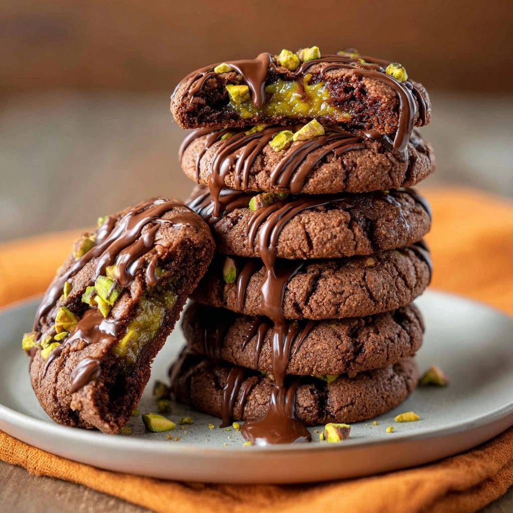 - Geschmolzene Schokolade über die abgekühlten Kekse träufeln, mit Pistazien bestreuen und fest werden lassen. Fertig – perfekte Textur, cremige Überraschung pur!