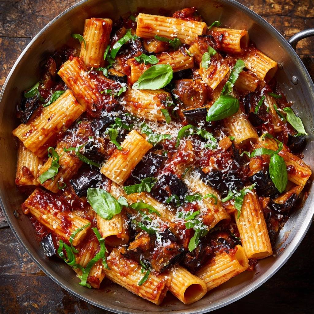 - Die richtige Pasta-Wahl: Rigatoni sind ideal, weil ihre großen Öffnungen und die geriffelte Oberfläche die stückige Soße und die Auberginenwürfel förmlich einfangen. Penne Rigate funktionieren ebenfalls gut.