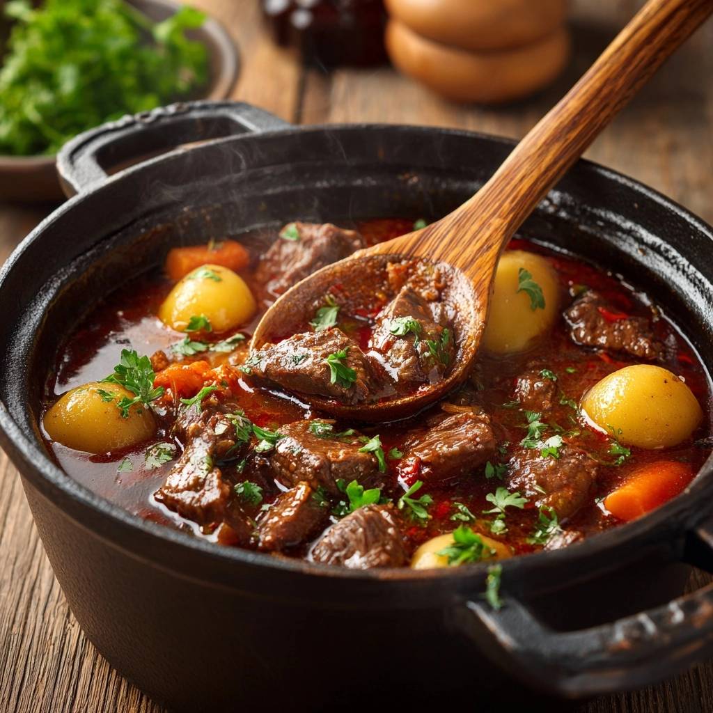 Stell dir vor, du nimmst die erste Gabel dieses Rindergulaschs mit Kartoffeln und Karotten. Das Fleisch schmilzt auf der Zunge, saftig und zart, umhüllt von einer sämigen Sauce, die nach geröstetem Paprika und Knoblauch duftet. Der Biss in die Kartoffeln ist perfekt weich, die Karotten süßlich knackig. Ich hab das Gericht letztens wieder gekocht und konnte nicht aufhören, Portionen nachzulegen.