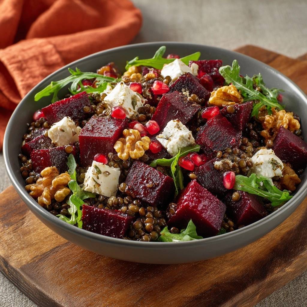 Stell dir vor, du beißt in diesen Salat rein. Die Linsen knacken al dente zwischen den Zähnen, die Rote Bete gibt saftige Süße ab, Walnüsse knirschen herrlich, und der Granatapfel explodiert mit fruchtigem Saft. Feta schmilzt cremig auf der Zunge, Rucola bringt Pfeffriges dazu. Du wirst süchtig danach.
