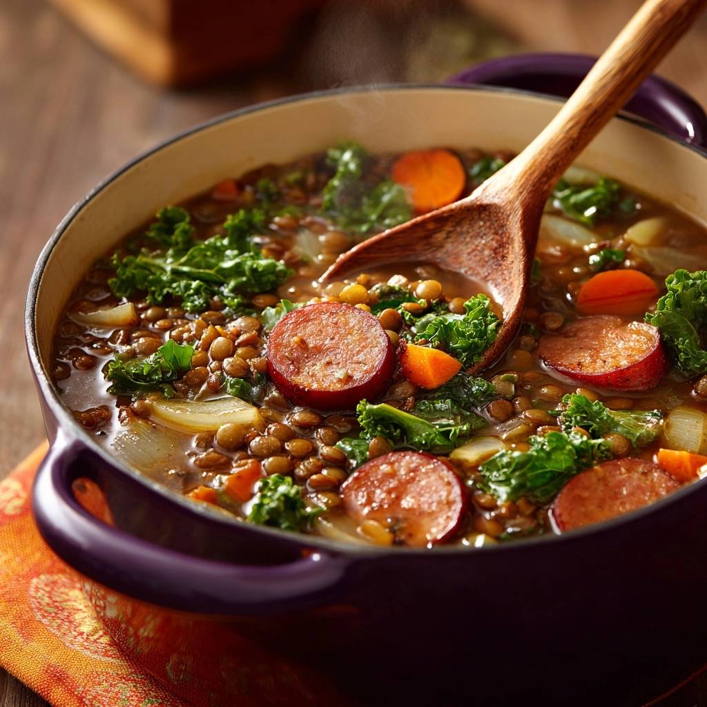 Stell dir vor, du löffelst den ersten Bissen dieses sämigen Linseneintopfs. Die Linsen haben Biss, der Grünkohl knusprig-frisch, Karotten süß knackig und die Putenwurst raucht würzig durch. Kein Brei, nur pure Freude im Topf.