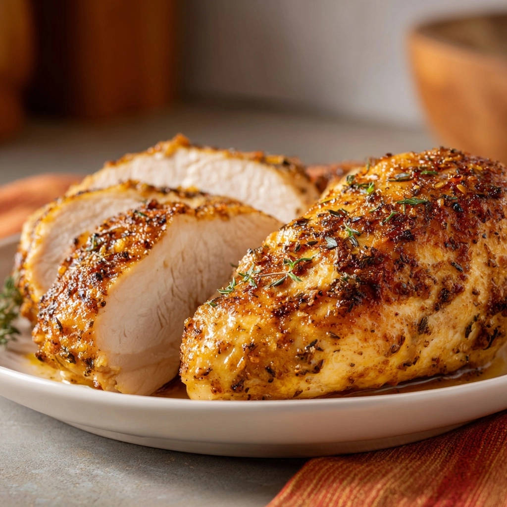 - Schneide die perfekt saftige Hähnchenbrust in Scheiben und serviere sie sofort. Genieße dein garantiert nie wieder trockenes Hähnchen!