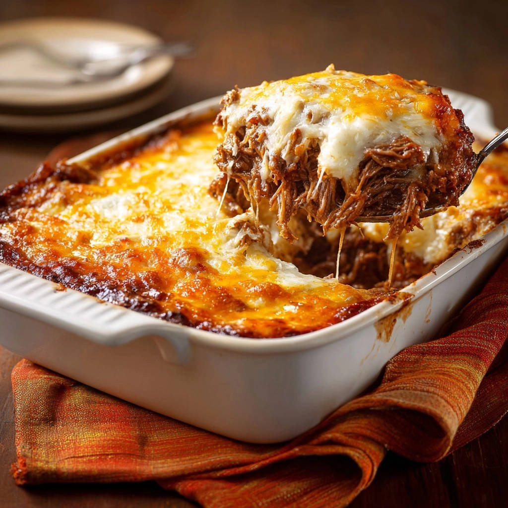 - Den fertigen Saftigen Rinderauflauf garnieren und servieren.