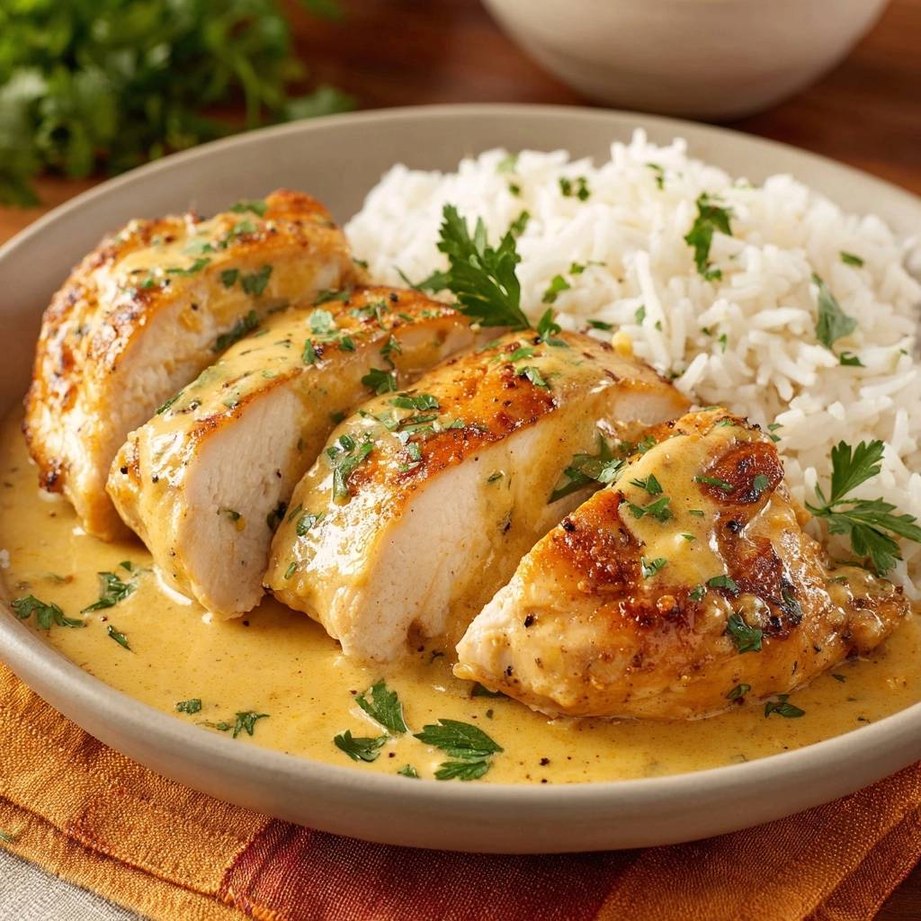 - Hähnchen herausnehmen, in Scheiben schneiden. Sauce einkochen lassen, mit gehackter Petersilie abschmecken. Auf Teller mit Reis anrichten, Sauce darübergeben. Fertig – saftig, cremig, unwiderstehlich!