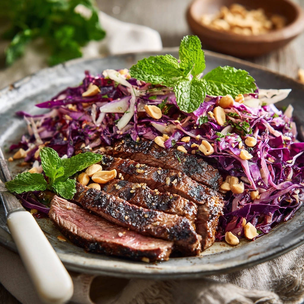 - Servieren: Den Asia-Krautsalat auf Tellern anrichten, die Steakscheiben daneben oder darauflegen. Mit gerösteten Erdnüssen und frischen Minzblättern großzügig garnieren. Sofort servieren und den saftigen Genuss erleben!