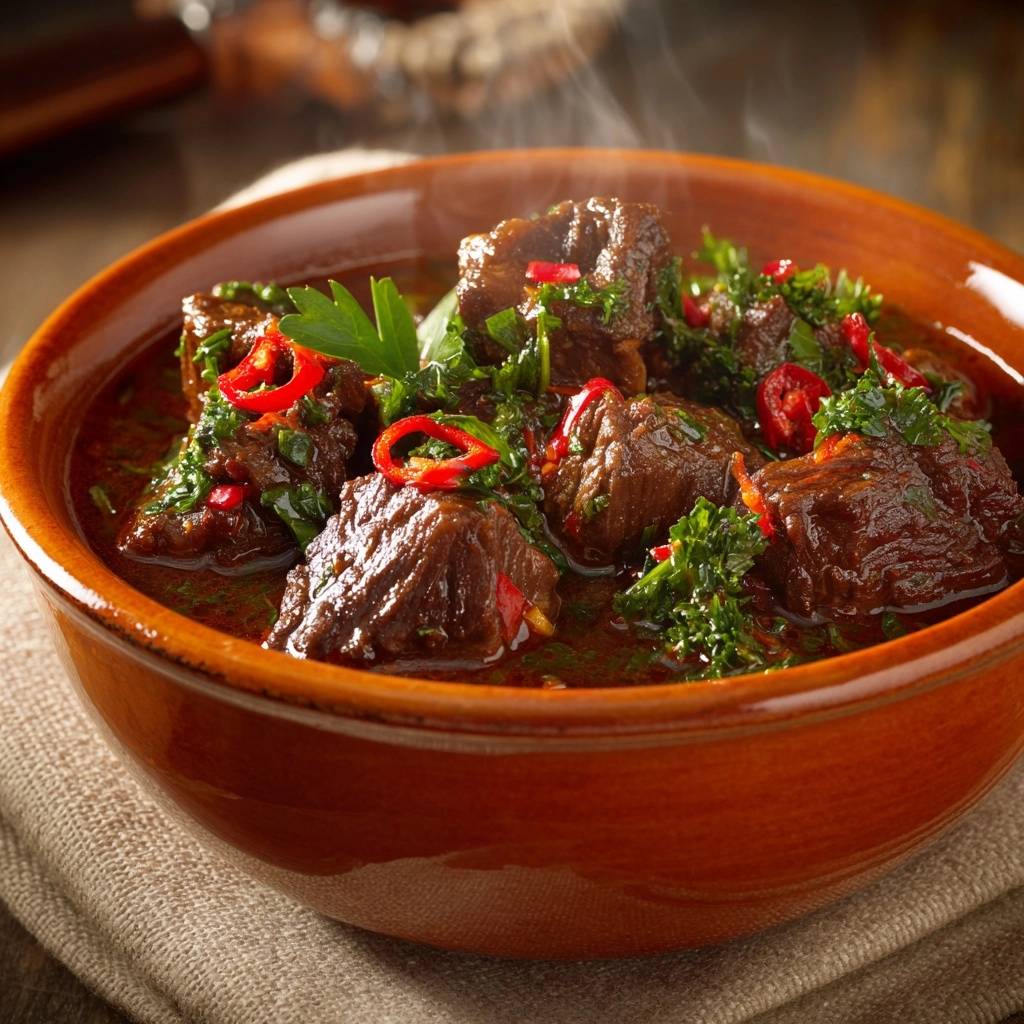 Stell dir vor, du beißt in ein Stück Rindfleisch, das zart auf der Zunge zerfällt. Der scharfe Chili-Kick explodiert, Koriander erfrischt alles. Dampf steigt auf, der Duft von gerösteten Gewürzen füllt die Küche. Das ist Scharfes Rindfleisch mit Chili und Koriander, dein neuer Favorit.