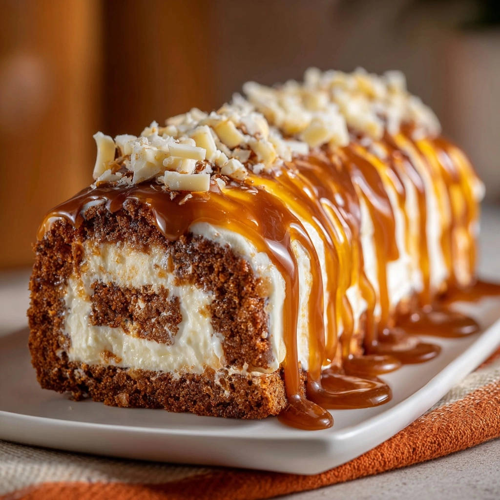 - Kurz vor dem Servieren die kalte Roulade auf eine Servierplatte legen. Das leicht abgekühlte, aber noch flüssige Karamell-Topping großzügig darüber gießen, sodass es an den Seiten herunterläuft. Mit gehackter weißer Schokolade bestreuen und sofort servieren. Genießen Sie jeden rissfreien Bissen!