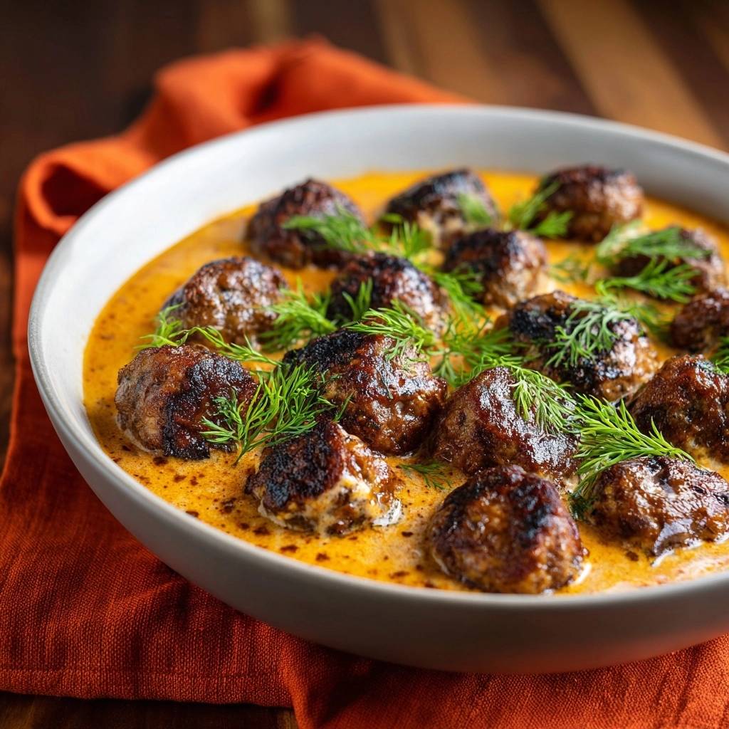 - Fleischbällchen in die Sauce geben, 5 Minuten bei niedriger Hitze ziehen lassen – die Kruste bleibt knackig, innen saftig. Mit gehacktem Dill bestreuen.